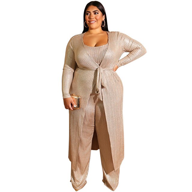 New Plus Size Women Set Gold Lace Up Suit Set Vest Wide Leg Pants Long Coats 3 Piece Sets Sexy Outfits Casual